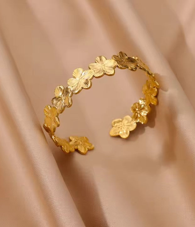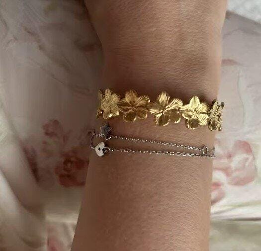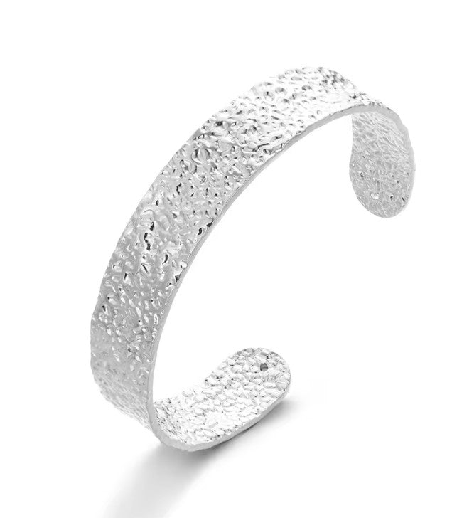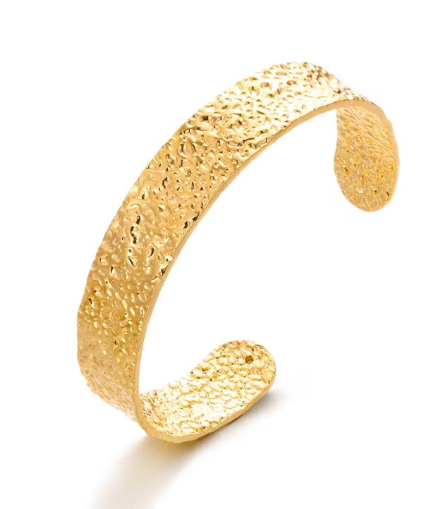 La Collection HÉLIA célèbre la lumière, la force et l’élégance brute. Inspirées par les reflets du soleil et les textures organiques, ces manchettes dorées ou argentées en acier inoxydable, aux finitions martelées, apportent du caractère à chaque tenue.