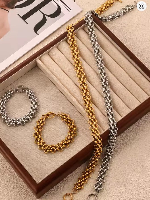 Sublimez votre style avec cet ensemble raffiné composé d’un bracelet et d’un collier dorés à la finition brillante et moderne. Conçu en acier inoxydable 316L de haute qualité, ce bijou résiste au temps, à l’eau et à l’usure quotidienne tout en conservant son éclat luxueux.